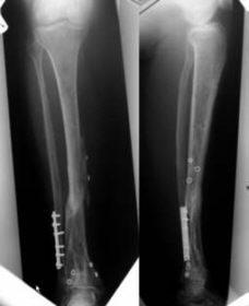 comminuted fracture of her right tibia in a road traffic accident.